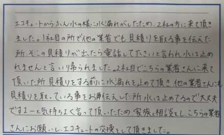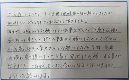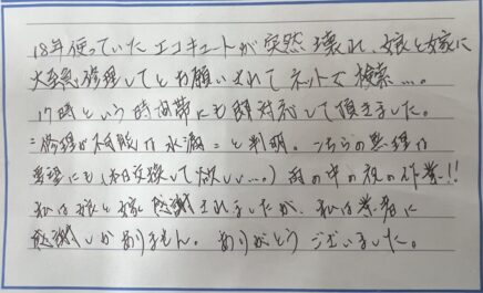 電気温水器が故障し、急なお願いにもかかわらず、すぐに対応していただきました。